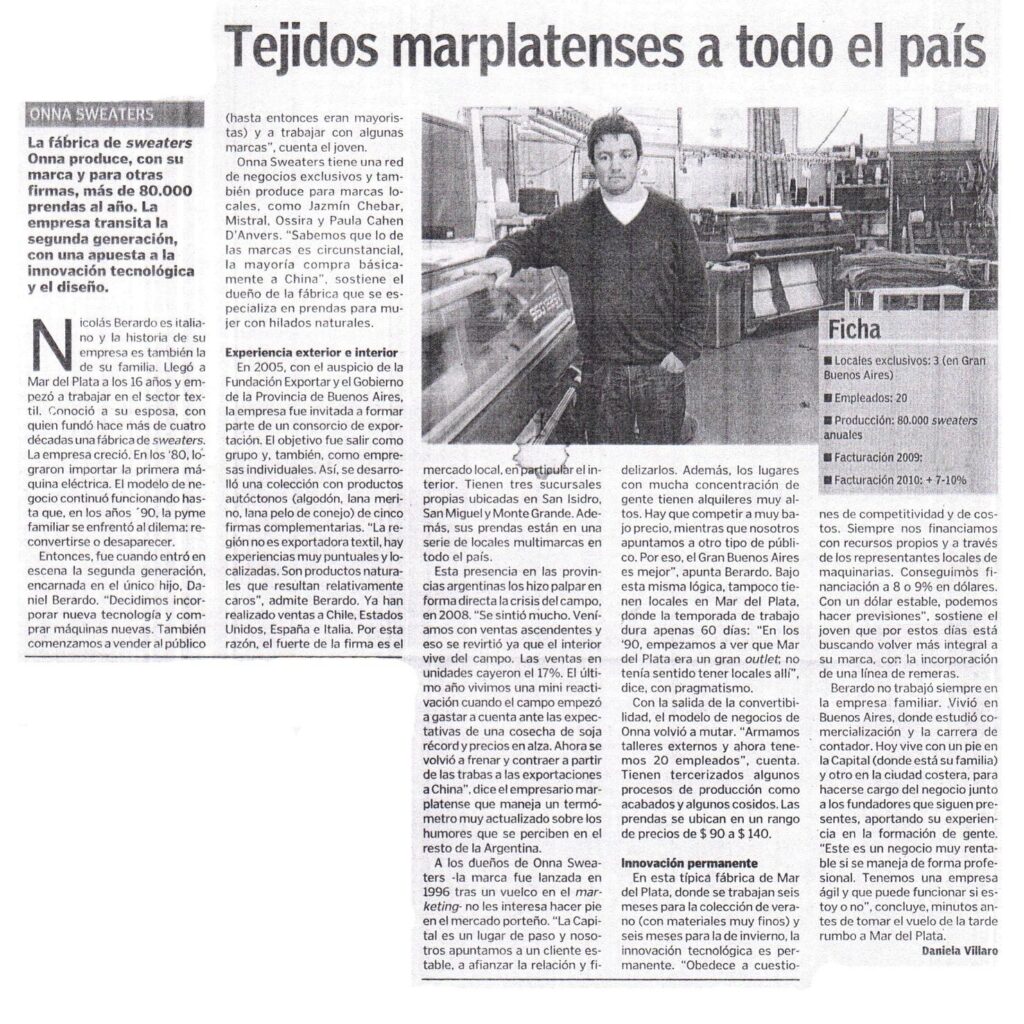 Nota El Cronista Onna Sweaters es considerada una de las empresas lideres en el sector y asi lo refleja esta nota realizada al Sr. Nicolas Daniel Berardo por el prestigioso diario El Cronista Comercial.